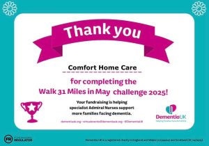In May, team members from Comfort Home Care took on the challenge of walking 31 miles in support of dementia awareness. Each step represented the journey so many of our clients and their families face every single day.